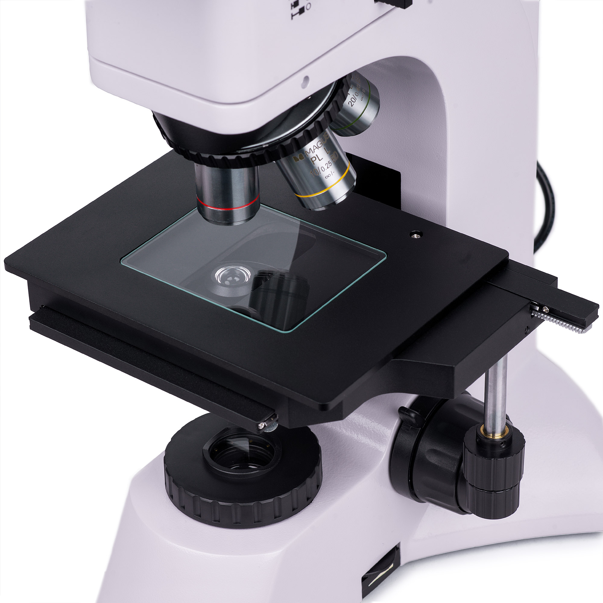 The magnification of the microscope in the basic configuration is 50–400x. Additional objectives and eyepieces will increase the range of magnification. The microscope uses plan achromatic objectives with long working distance for brightfield and darkfield microscopy techniques. There are five slots in the revolving nosepiece for mounting objectives – four objectives are included and one is optional. The revolving nosepiece with objectives is oriented toward the interior – the user can see the objective inserted into the optical path.