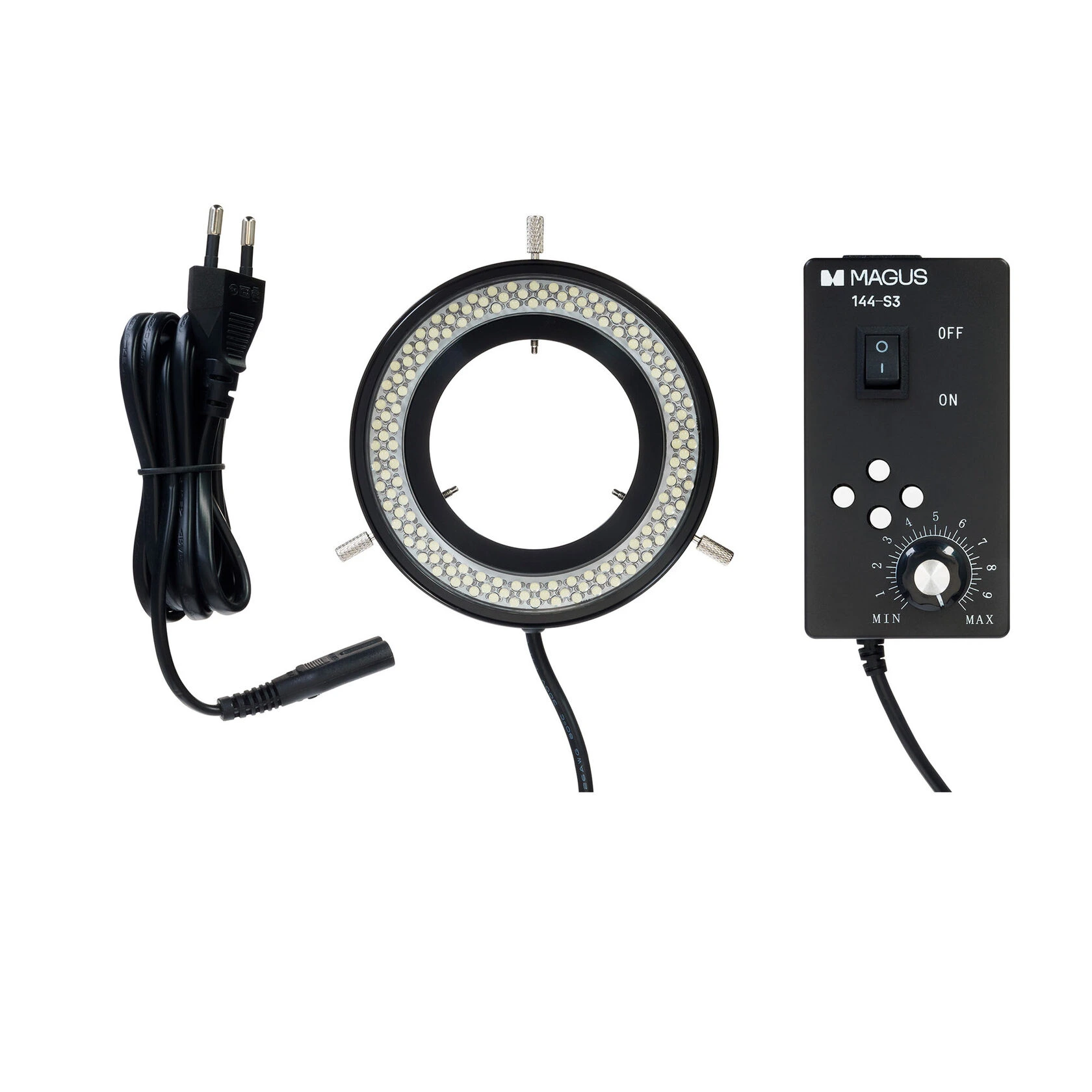 The MAGUS LED 144-S4 Ring Light is a professional-grade illumination system designed to deliver uniform, adjustable lighting for stereomicroscopes. Equipped with 144 high-intensity LEDs arranged in four independently controlled sectors, it provides flexible lighting modes suited for a wide range of microscopy tasks — from shadow-free inspection to oblique illumination for enhanced surface contrast.