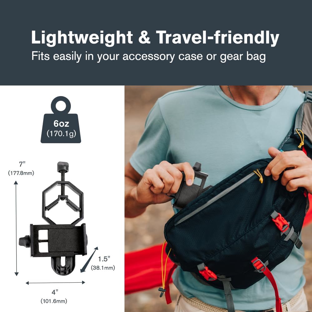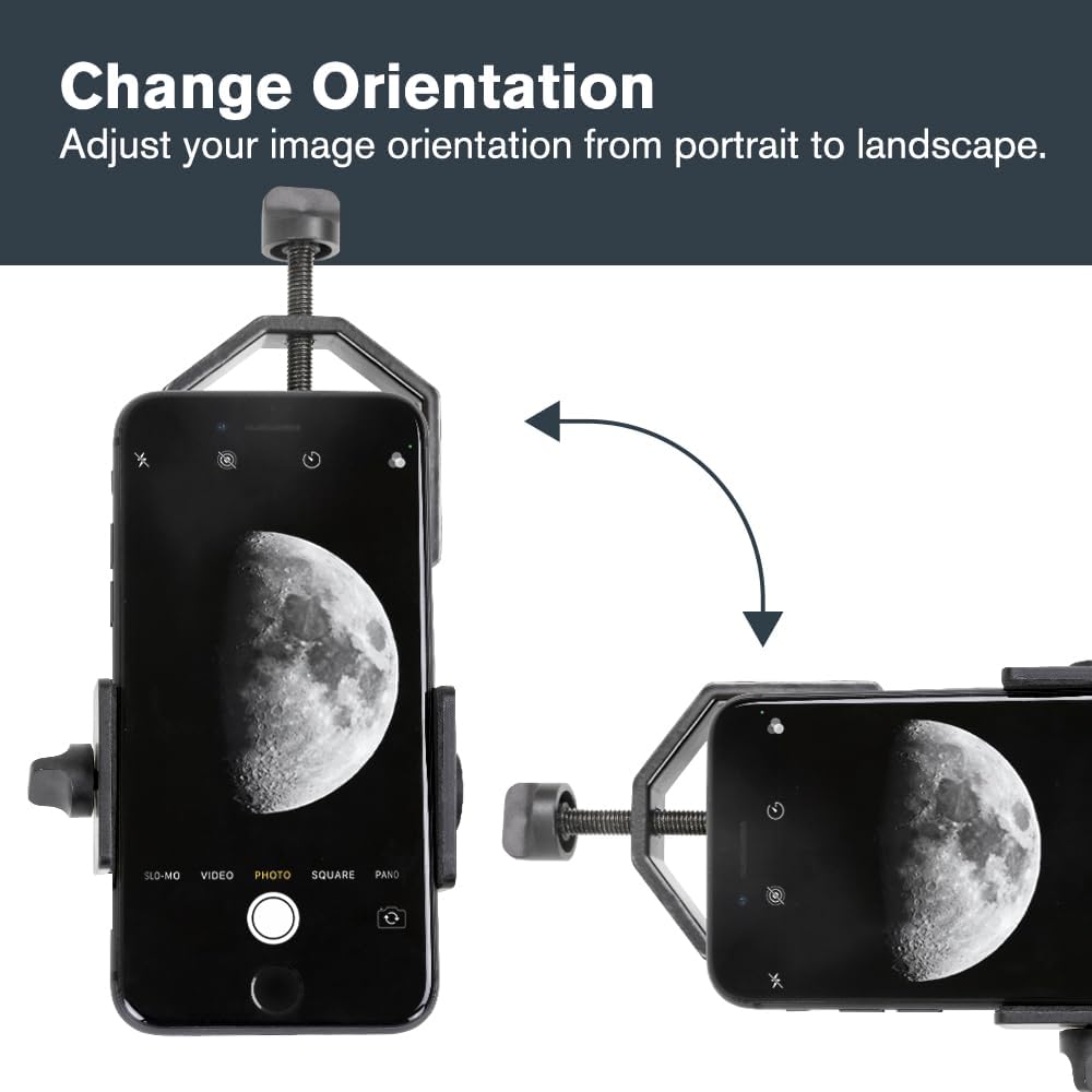 - Simple to use! Place your phone in the adapter, center your phone’s camera over the eyepiece, and use the knobs to secure the adapter in place.
